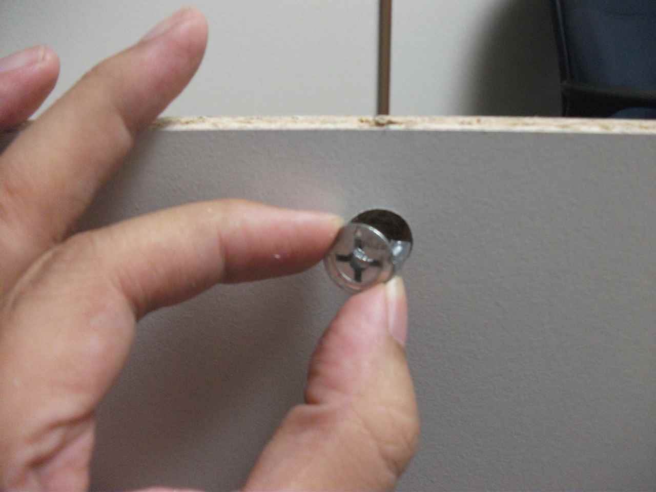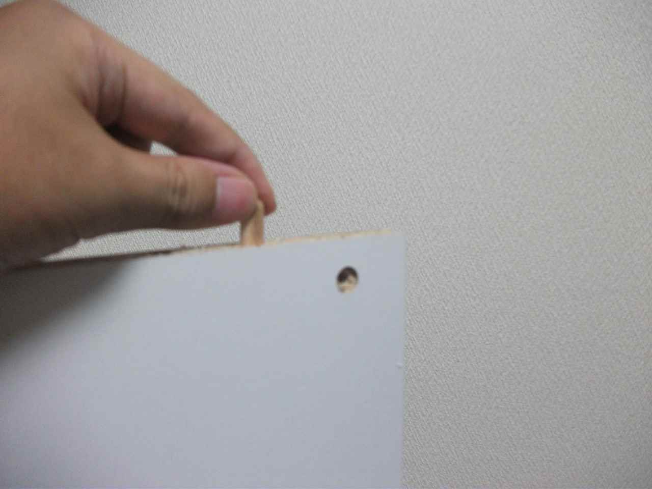 見た目が丸い金属の部材であるカムロック受けを取り付けます。