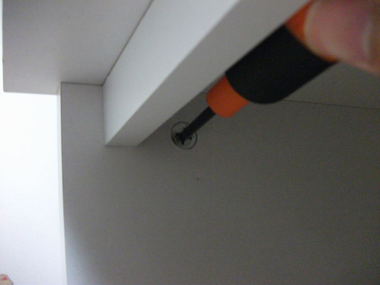 カムロック(ネジ)をカムロック受けの空洞部分に差し込み、十字の溝に当てたドライバーを時計回り(右向き)に180度、またはその手前くらいまで回して固定します。